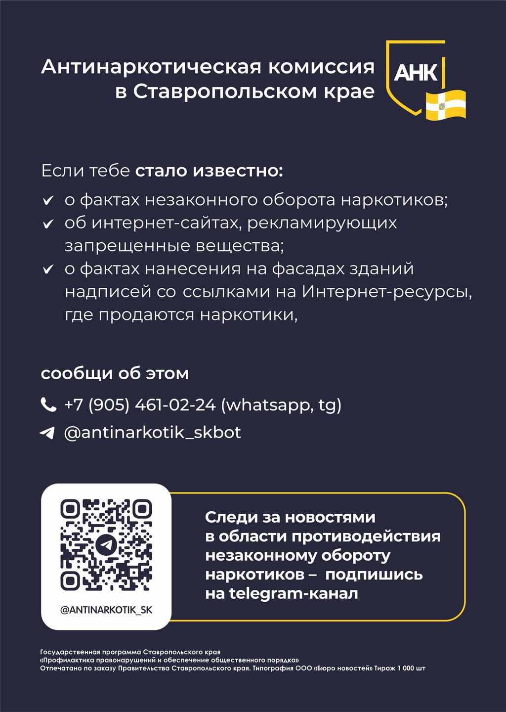 В целях формирования антинаркотического мировоззрения среди подростков и молодежи аппаратом антинаркотической комиссии в Ставропольском крае в текущем году будет продолжена работа Telegram-канала (t.me/antinarkorik_sk), на котором будет размещаться актуальная информация о вреде потребления наркотиков и последствиях участия в их незаконном обороте. Присоединяйтесь https://t.me/antinarkotik_sk/1507